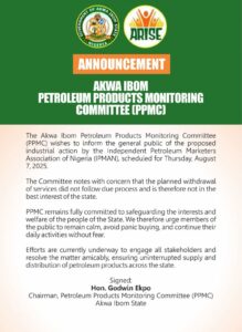 The Chairman of the Petroleum Product Monitoring Committee, Hon. Godwin Ekpo, has called on residents of Akwa Ibom State to remain calm in the face of a proposed strike by the Independent Petroleum Marketers Association of Nigeria (IPMAN), which is scheduled to begin today, Thursday.